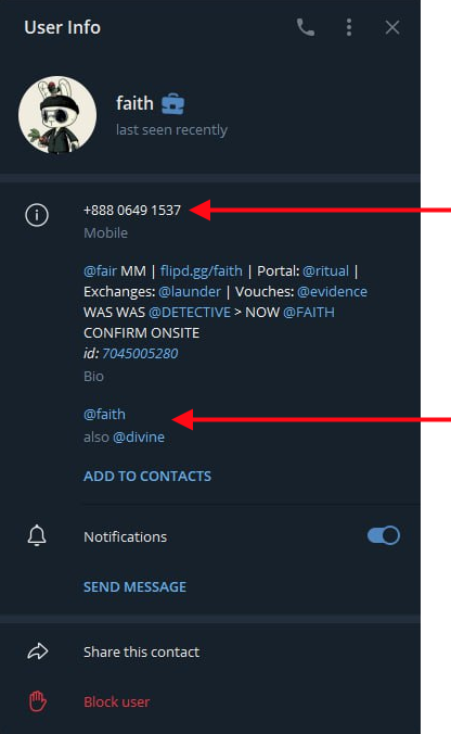 My number is showing and it will always be +888 0649 1537My usernames will always be @faith and @divine. Check to make sure they aren't in the bio or location.